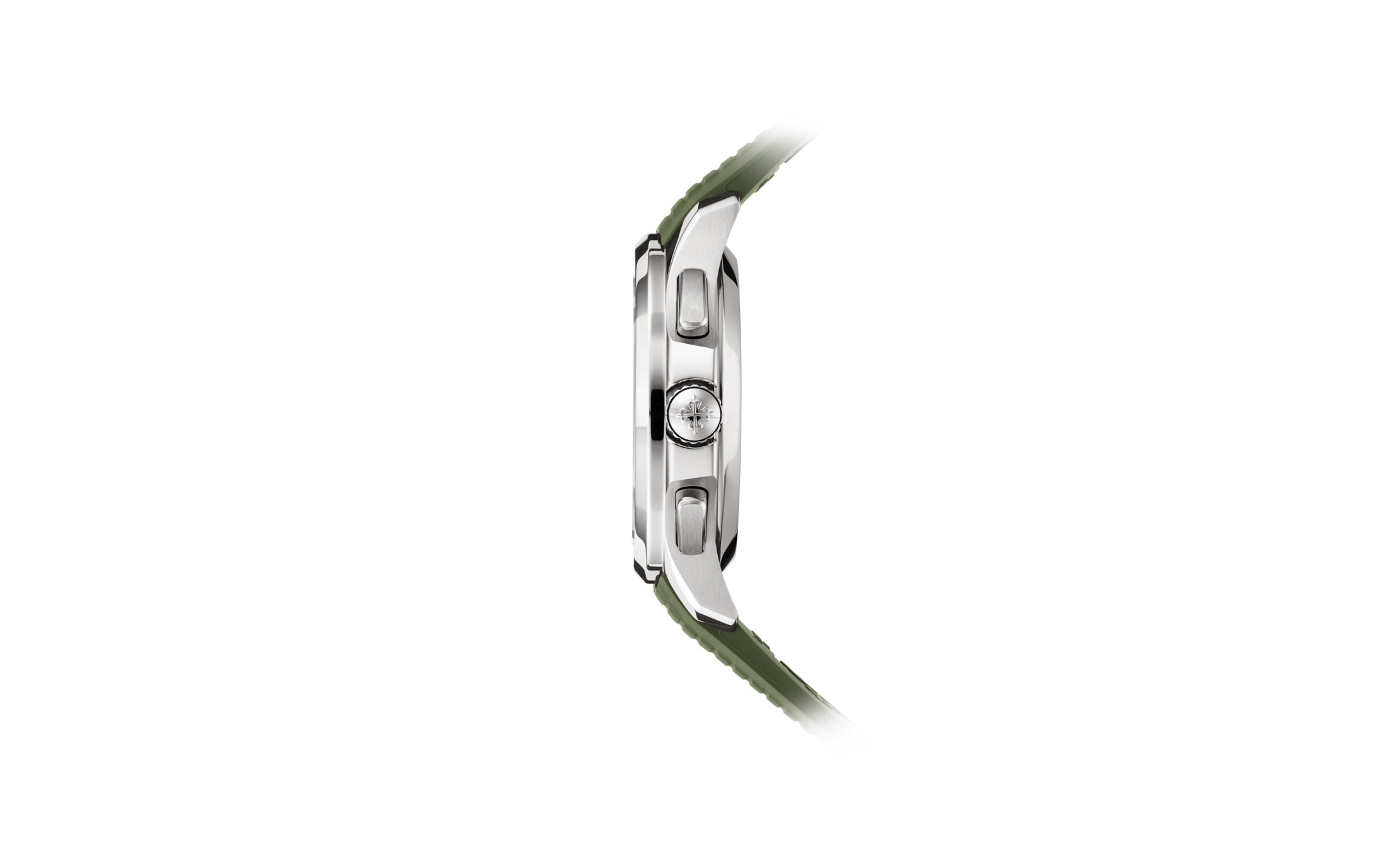 New Patek Philippe Aquanaut Chronograph luxury sports watch, 42,2mm, 18k White Gold, Ref. 5968G-010. The first chronograph with a flyback function in the modern Aquanaut sports collection, which perfectly matches the character of this young and dynamic watch line. His 18k White Gold rounded, pillow-like octagon-shaped case and gently curved ears are unmistakable. On a beautiful Khaki green dial with embossed embossing, perfectly readable large applied polished Arabic numerals made of 18k White Gold with luminescent coating in the form of hour markers look harmoniously. The manufacturer paid special attention to the second track on the outer rim of the dial. She is applied in long and short silvery lines with fairly wide luminous marks located every 5 minutes. Large polished luminous hour and minute hands in 18k White Gold indicate the time. These are complemented by a slim and elegant chronograph second hand (Sweep seconds hand). At the 6 o’clock position, there is a recessed green auxiliary chronograph counter with reverse movement repeating which follows the rounded octagonal shape of the bezel. It has glowing white Arabic numerals, white markers, and a white indicator needle. The date window is traditionally at the 3 o’clock position. Rectangular 18k White Gold buttons located on the right side of the case control the chronograph. At the 8 o’clock, position on the case is an instant date corrector. A polished 18k White Gold screw-down crown with a ribbed edge for a comfortable grip and the Patek Philippe logo is the finishing touch to the perfect picture. The dial is covered with a scratch-resistant sapphire crystal. The screw-down case back is also made of sapphire crystal, which allows you to see the magical work of the movement. Against this backdrop, a flat, fixed bezel in 18k White Gold, vertically ground on the front and polished on the sides, provides a wide view of the dial. The finish on the side of the bezel is amazing because at first glance, it looks rounded, but upon closer inspection, you can see the crisp edges playing with the light. The model is equipped with a Patek Philippe caliber CH 28‑520 C with a self-winding mechanical movement containing 32 jewels and a power reserve of min. 45 hours – max. 55 hours. This beautiful sport chic watch is presented on a Khaki green tropical rubber strap. This new composite material is highly resistant to wear, salt water and UV radiation. The strap are fastens with Patek Philippe’s patented 18k White Gold folding clasp, polished and engraved with the Calatrava cross. Opening the clasp reveals the engraved Patek Philippe logo with the word GENEVE. Water resistant up to 120m/394ft (12 ATM).