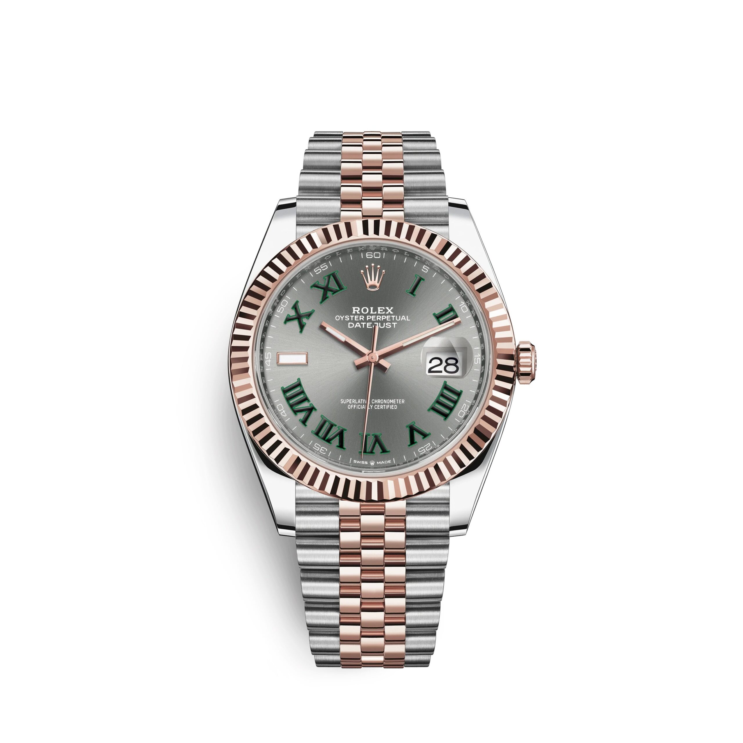 Rolex Datejust 41 watch with polished 18k Everose Gold and Stainless Steel case, Reference 126331-0016. This model has Slate dial with highly legible Chromalight display with long-lasting blue luminescence. The dial is adorned with polished 18k Everose Gold hands – hour and minute hands with partial luminous fill and applied polished Green colored Roman numerals hour markers. Fine printed minute track on teh dial perimeter with Arabic numerals marking every 5-minute interval. Date window with a “Cyclops” magnifying lens displayed at the 3 o’clock position. Polished 18k Everose Gold “Twinlock” crown, featuring two sealed zones when the crown is screwed down: the first inside the tube of the crown, the second inside the winding crown itself. The dial closed by a Scratch-resistant Sapphire Crystal and solid case back made. The watch is equipped Fluted fixed polished 18k Everose Gold bezel. The watch is mechanical self-winding Manufacture Rolex 3235 contains 31 Jewels and has an approximate power reserve of 70 hours of power reserve. This model presented on Jubilee bracelet of brushed Stainless Steel outer links and polished 18k Everose Gold center links with a Folding Oysterlock safety clasp with Easylink 5 mm comfort extension link. The water resistance is up to 100m/330ft (10 ATM).