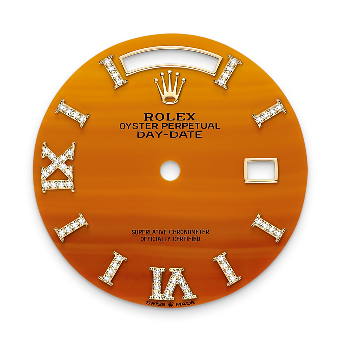 Unworn watch Rolex  Day-Date 36, 18k Yellow Gold with Diamond-set, 36mm, Ref# 128238-0088. New for 2023 in the Oyster Perpetual Day-Date 36, series are watches with dials made of decorative stones. Thanks to the unique crystallized effects, matrices and veins of aventurine, carnelian and turquoise, and their skillful processing, each dial turns into a unique work of art, being a worthy addition to the rest of the flawless Day-Date details. As always elegant and luxurious Day-Date 36 – is an excellent choice for people who appreciate unique beauty, high style and absolute comfort. The dial is carved from Carnelian, an orange-colored stone characterized by lines of various shapes and sizes, forming an intricate cameo of patterns. Its index hour markers and Roman numerals VI and IX in 18k Yellow Gold are respectively set with 32 and 24 diamonds, using a flawless setting and leveling technique that highlights the stones’ subtle brilliance. The classic polished hands made of 18k Yellow Gold look amazing on such a dial, emphasizing the sophistication of the model. The date indicator is traditionally placed at the 3 o’clock position. At the 12 o’clock, position is a semi-circular window showing the day of the week in full, providing an instantly recognizable, unique design of Day-Date. The ribbed screw-down crown in 18k Everose Gold Triplock with double watertight system, adorned with the Rolex logo, is a traditionally recognizable part of Rolex watches. The dial is covered with a scratch-resistant anti-reflective sapphire crystal and a Cyclops lens above the date with double anti-reflective coating. A solid 18k Yellow Gold screw-down case back with fine fluted edges, closes the movement. The fluted fixed 18k Yellow Gold bezel is not only an aesthetic element of this watch, but also a true hallmark of Rolex. The in-house Rolex mechanical movement, caliber 3255, contains 31 jewels and has an approximate power reserve of approximately 70 hours powers. This delightful timepiece is presented on an 18k Yellow Gold President bracelet with semi-circular 3-piece links for flawless beauty. It features Rolex’s original concealed folding Crownclasp to secure the watch on your wrist. Water resistant up to 100m/330ft (10 ATM).