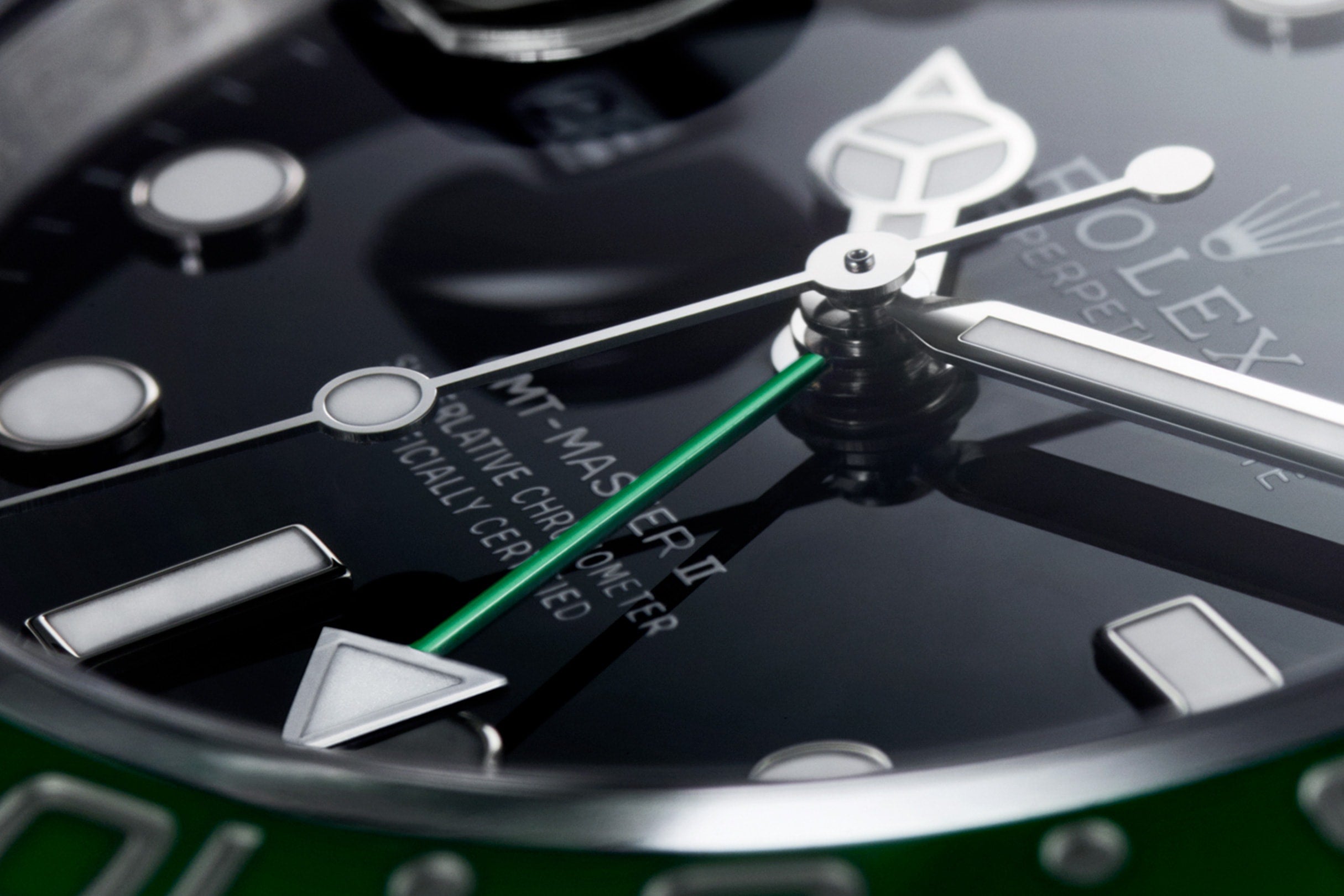 Dial color Black lacquer dial features 18K white gold hands with round, rectangular and triangular indexes. The GMT hand is green lacquered. All the hands and hour-markers are filled with Chromalight, which offers a striking blue glow