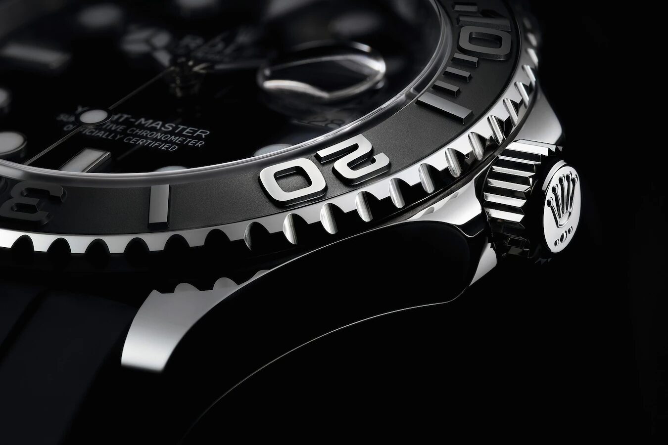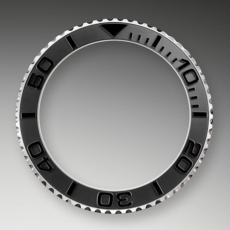 Rolex Yacht-Master 42 watch with polished 18k White Gold case. This model has black dial with a polished 18k White Gold hour and minute hands in Mercedes-logo and Breguet-style sword shape with luminous fill. Polished 18k White Gold seconds hand. Applied polished 18k White Gold rimmed index doty hour markers with luminous fill. Fine printed minute/seconds track on the dial rim. Highly legible Chromalight display with long-lasting blue luminescence. Date window displayed at the 3 o’clock position with a cyclops magnifier. Polished 18k White Gold patented “Triplock” locking crown ensuring that the crown screws down onto the Oyster case as securely as a submarine hatch. The dial closed by a Scratch-resistant Sapphire Crystal and solid case back made. Stop-seconds for precise time setting. The watch is equipped polished 18kt White gold bidirectional rotating bezel with a ribbed edge for a sure grip. Matt black Cerachrom bezel insert in ceramic with polished finished raised Arabic Numerals and graduating indexes. The movement is mechanical self-winding 3235, containing 31 Jewels and 70 hours of power reserve. The Rolex Oysterflex bracelet of flexible metal blades overmoulded with high-performance elastomer with folding Oysterlock safety clasp with Rolex Glidelock extension system. The water resistance is up to 100 meters/330 feet.