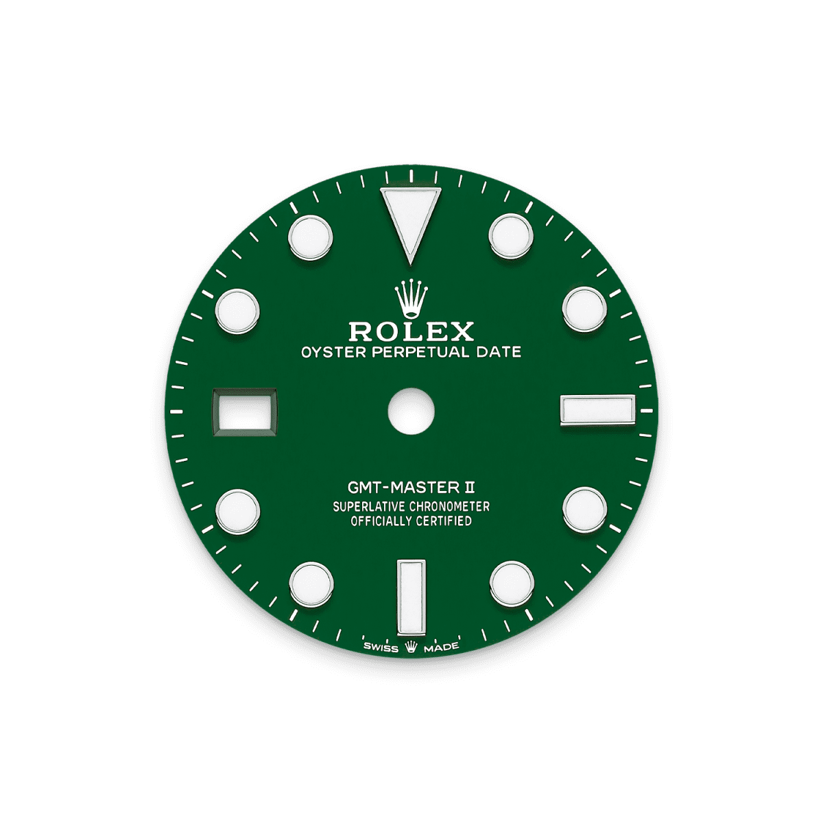 Introducing the Rolex GMT-Master II Ref# 126729VTNR-0001 is a remarkable fusion of innovation and elegance, tailored for discerning travelers and watch enthusiasts. Crafted from solid 18k White Gold, the 40 mm Oyster case exudes luxury and durability. The green ceramic dial with a polished 18k White Gold hour and minute hands in Mercedes-logo and Breguet-style sword shape with luminous fill and polished 18k White Gold seconds hand creating a cohesive and striking appearance. The dial is elegantly detailed with applied, polished 18k White Gold rimmed dot hour markers, each filled with luminous material for clear readability in any light. Surrounding the dial, a finely printed minute and seconds track enhances both precision and sophistication, adding a refined touch to the watch’s functional beauty. The watch features a highly legible Chromalight display with a lasting blue luminescence for unmatched readability in low light. At 3 o’clock, a date window with a Cyclops lens ensures effortless visibility. The black and green Cerachrom bezel insert, forged from ultra-durable ceramic, is scratch-resistant, corrosion-proof, and impervious to UV rays, preserving its deep tones over time. Polished Arabic numerals and index markers in matte white gold enhance legibility on the 24-hour scale, while the bi-directional rotating bezel offers a ribbed edge for a secure grip. The distinctive silvered GMT hand, tipped with a luminous arrowhead, allows simultaneous tracking of a second time zone. A polished 18k White Gold “Triplock” crown seals tightly against the Oyster case—much like a submarine hatch—ensuring robust water resistance up to 100 meters. Notably, the crown and crown guard are positioned on the left side of the case, a distinctive feature that sets this model apart. The watch is powered by Rolex’s self-winding Calibre 3285, equipped with 31 jewels and offering an impressive 70-hour power reserve, along with stop-seconds functionality for precise time setting. Protected by a scratch-resistant sapphire crystal and a solid caseback, this model is paired with a luxurious 18k White Gold Oyster bracelet, featuring brushed outer links, polished center links, and a folding Oysterlock safety clasp with an Easylink comfort extension. A flawless union of form and function.