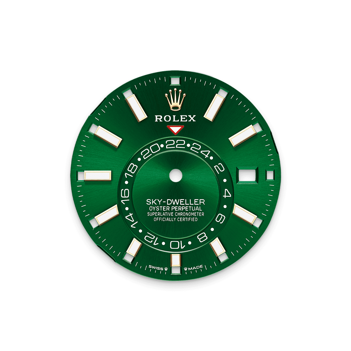 Introducing unworn Rolex Sky-Dweller watch, Ref# 336238-0004 is a masterful blend of sophisticated engineering and luxurious design, tailored for the global traveler. New 2025, from 18k Yellow Gold with 42 mm Oyster case timepiece features a vibrant bright green dial. The dial’s Chromalight display ensures legibility in low-light conditions, with rectangular index hour markers and longer hands emitting a long-lasting blue luminescence. A fixed inverted red triangle points to the chosen reference time on the 24-hour disc, and a deep red rectangle in one of the 12 apertures around the dial indicates the current month, enhancing the watch’s intuitive readability. At the heart of the Sky-Dweller lies, the Rolex Calibre 9002 contains 40 jewels and has an approximate power reserve of approximately 72 hours powers, a self-winding mechanical movement that offers dual time zone functionality and an annual calendar. The off-center 24-hour disc allows for easy reading of home time, while the central hands display local time. The Saros annual calendar automatically differentiates between 30- and 31-day months, requiring only one date adjustment per year, at the end of February. The fluted bezel in 18k Yellow Gold is a true hallmark of Rolex. Bidirectional rotatable, it is part of the Ring Command system and, when interacting with the crown, allows the user to select watch functions one by one and adjust them easily, quickly and simply. Completing the timepiece is the Oysterflex bracelet of Flexible metal blades overmoulded with high-performance elastomer, known for its comfort and elegance, featuring and equipped with an 18k Yellow Gold Folding Oysterclasp with Rolex Glidelock extension system for optimal fit. The Sky-Dweller is waterproof to 100 meters (330 feet), ensuring durability alongside its refined aesthetics.